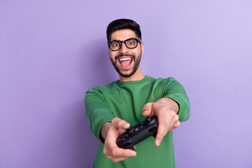 Photo of positive cheerful good mood gamer wear green long sleeve impressed playstation have fun isolated on purple color background