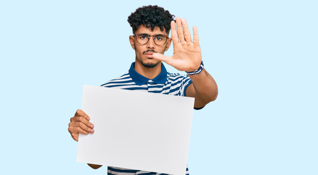 Young arab man holding blank empty banner with open hand doing stop sign with serious and confident expression, defense gesture