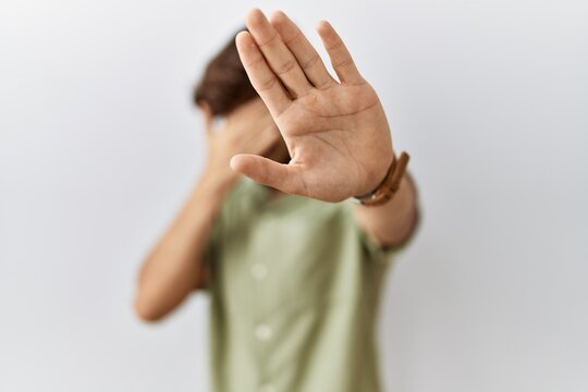 Young arab man wearing casual t shirt covering eyes with hands and doing stop gesture with sad and fear expression. embarrassed and negative concept.