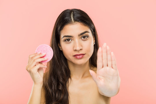 Young arab woman standing over pink background covering eyes with hands and doing stop gesture with sad and fear expression. embarrassed and negative concept.