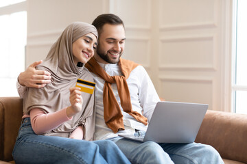 Side view of satisfied positive indian or arabian guy in stylish clothes sitting on a sofa in a living room, using laptop and bank card to pay online, ordering goods and clothes, home delivery, smiles