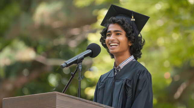 Cheerful young graduate with curly hair speaking at his graduation
