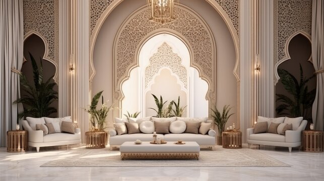 Arabic,Islamic style living room interior design with arch and arabic pattern.3d rendering