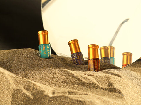 Arabic perfume Oud oil in glass bottle, close up. Aromatic Arabian oil