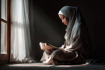 Islamic woman reading Quran near window with soft sunlight, modest dress, peaceful and reflective mood.