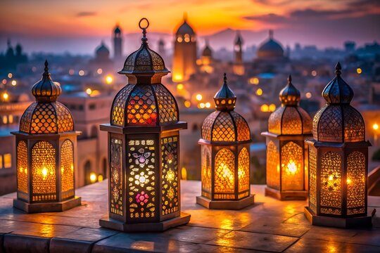Celebrating the holy month of ramadan with elegant mosque silhouettes and illuminated lanterns
