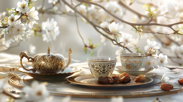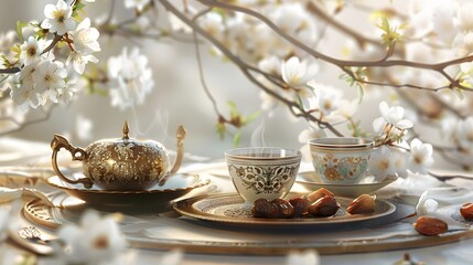 about Ramadan Kareem greeting card, invitation. Ornamental tea, coffee cup, bronze plate with dates fruit, white blooming prunus tree branch on white table. Iftar dinner. Eid ul Adha banner background