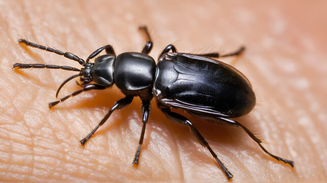 Deer tick on human skin, macro view of black mite on body, insect parasite close-up. Concept of bite, encephalitis disease, animal, nature, background