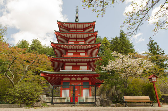 Exterior view of Chureito Pagoda against Fuji mountain in Arakura, Fujiyoshida, Yamanashi Japan