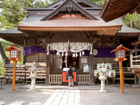 worshiper rings a bell at arakura sengen shrine in japan