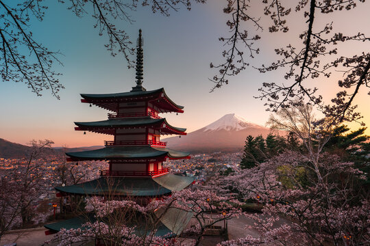 Chureito Pagoda and Fuji Mountain withP Pink Sakura in Spring at Sunset, Fujiyoshida, Yamanashi, Japan