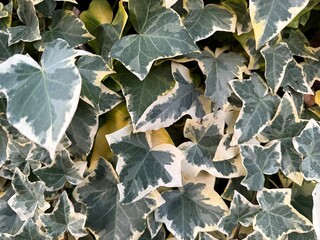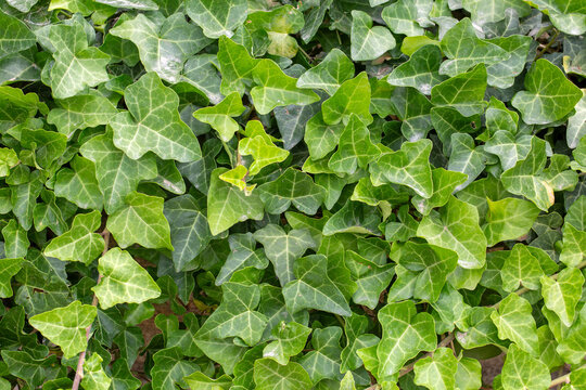 Wild ivy (hedera) leaves climbing on a wall. Full frame of evergreen ivy foliage as a background