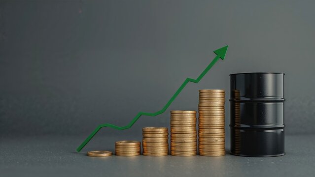 Decrease in crude oil revenue represented by oil tank on piled coins with descending price graph on plain background.