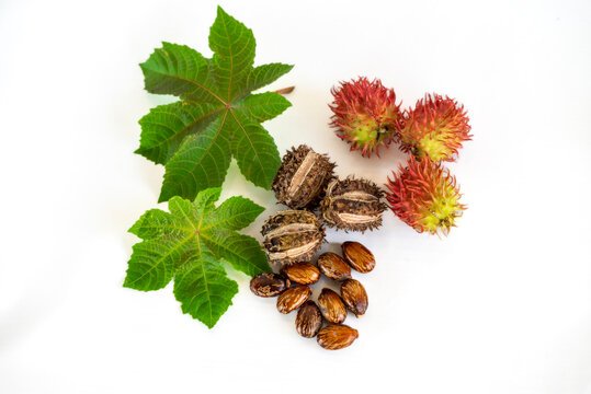 Top view of Castor oil (Ricinus communis) with castor fruits and leaves. Isolated on a white background.