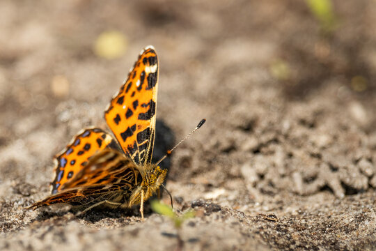 Butterfly pollinating flowers in the summer day. The map (Araschnia levana) is a butterfly of the family Nymphalidae. Map butterfly (Araschnia levana) spring generation insect on ground