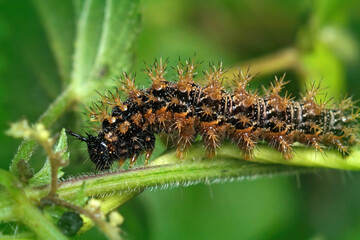 Closeup on the spiky caterpillar of the map butterfly, Araschnia levana , in the vegetation