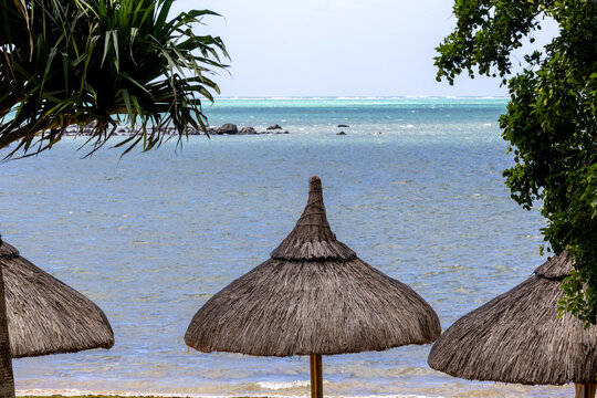 Sun umbrella and beach beds on tropical coastline, in Mauritius