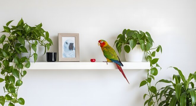 A colorful parrot, a golden-capped conure, sits on a white floating shelf surrounded by lush green houseplants in white pots.