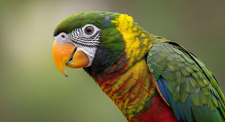 A detailed close-up profile of a Golden-capped Parakeet, showcasing its vibrant green, yellow, and red feathers.