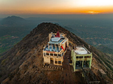 Aerial view of the Savitri Mata Temple atop the Aravalli Range, bathed in the warm glow of the setting sun, Pushkar Rural, Rajasthan, India.