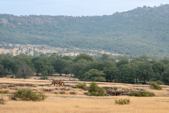wild male bengal tiger or panthera tigris walking territory stroll in open field and in background Aravalli or Aravali hill mountain Range in safari at ranthambore national park forest rajasthan india