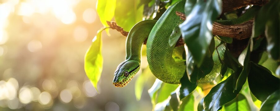 Vibrant green python coiled on branch in natural habitat