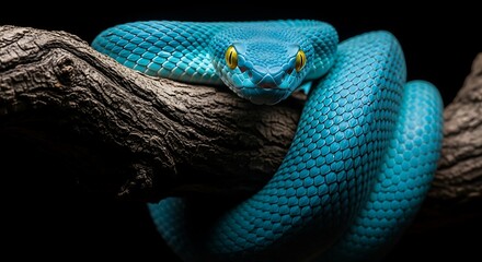 Yellow White-lipped Pit Viper on branch (Trimeresurus insularis), yellow viper snake low angle on black background