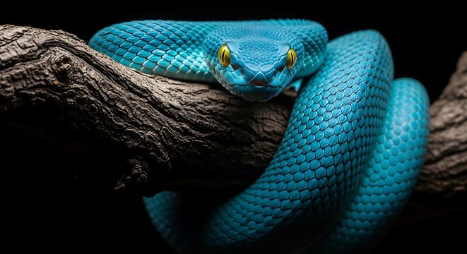 Green arboreal snake viper resting on tree branch