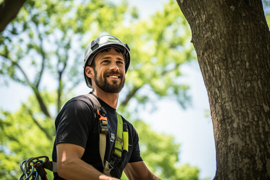 Tree surgeons wearing safety helmets and harnesses getting ready for a job involving tree climbing and maintenance