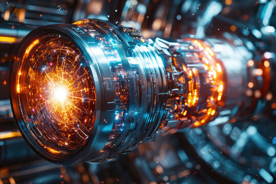 Cyberpunk Reactor Core: Close-up of a futuristic, glowing reactor core with intricate mechanical details, sparks, and vibrant orange and blue hues.