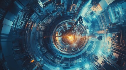 Detailed shot of a working fusion reactor prototype, with scientists making adjustments