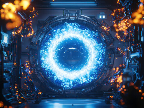 Ultra-clear shot of a fusion reactor prototype emitting a soft blue glow, with scientists