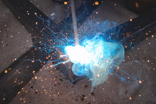 Electric arc welding in production, metal structure welding, large flash of light