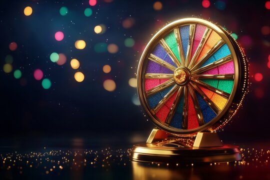 Colorful spinning prize wheel on a golden stand.  Sparkling bokeh lights highlight the vibrant segments