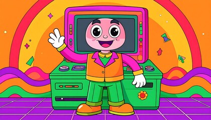 A retro-inspired character stands beside a vibrant, colorful arcade machine, radiating a playful and joyful mood.