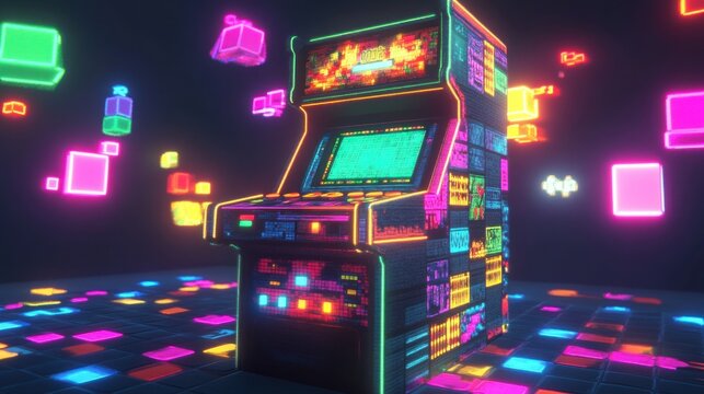 Retro arcade machine in vibrant neon lights, surrounded by glowing pixelated shapes and colorful geometric patterns in a futuristic gaming environment