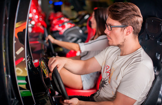 Asian woman playing with her multiethnic friends in racing games in an arcade game center while her friends celebrate and cheer