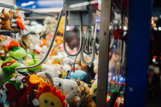 Claw crane grabbing plush toys in arcade machine at amusement park