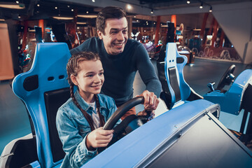 Dad helps his daughter drive a computer game.