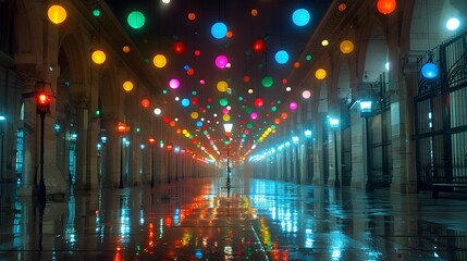 Person walking through colorful, rain-lit arcade.