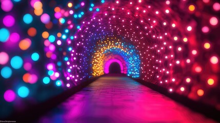 A vibrant, colorful tunnel with glowing lights.  The path leads to a dark end