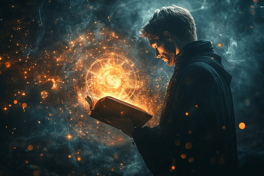 Silhouette of a man holding a book with arcane symbols glowing