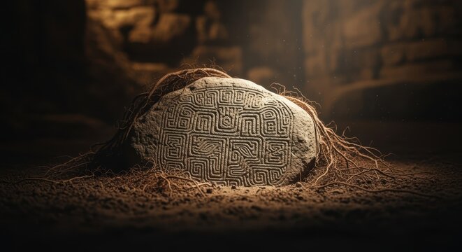 An ancient piece of amber discovered in an archaeological dig, partially buried in the earth, with hints of the past visible within its depths