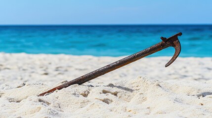 Ancient harpoon resting on sandy beach, partially buried with weathered wooden handle and rusted metal tip, evoking historical maritime heritage and archaeological significance