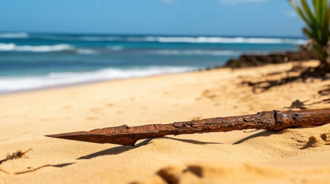 Ancient harpoon resting on sandy beach, partially buried with weathered wooden handle and rusted metal tip, evoking historical maritime heritage and archaeological significance.