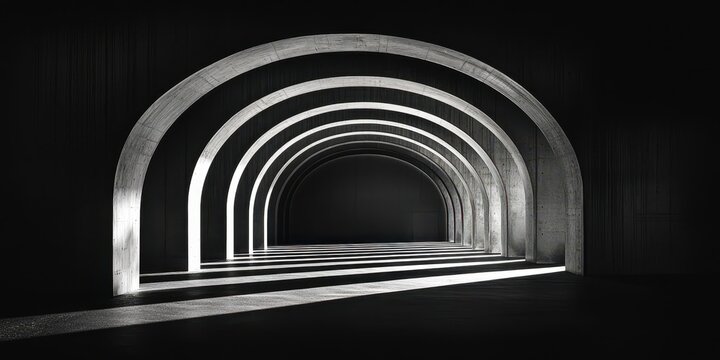 Futuristic glowing neon arches in dark corridor
