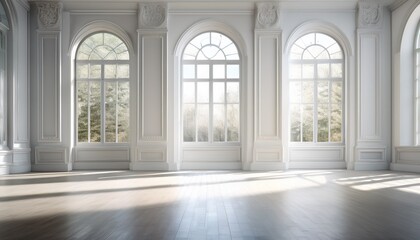 bright minimal white interior with large arched windows and intricate detailing creates elegant and serene atmosphere sunlight streams through casting soft shadows on floor