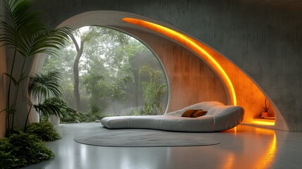 A spacious, contemporary interior featuring a curved, light-gray sofa, bathed in warm orange lighting, situated within a concrete structure with large arched windows overlooking a misty