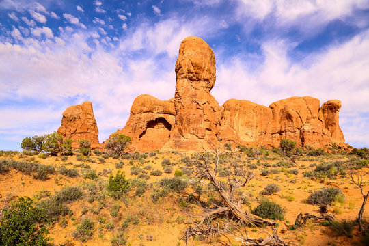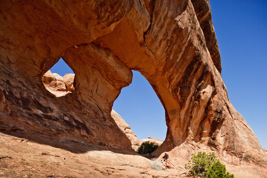 Woman (photographers wife) at Partition Arch to show dimensions, Arches national Park, Utah