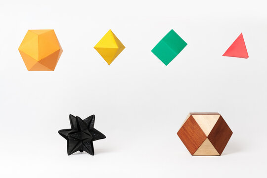 Archimedean solids archimedean solids arranged in vibrant colors on a bright yellow background with various textures